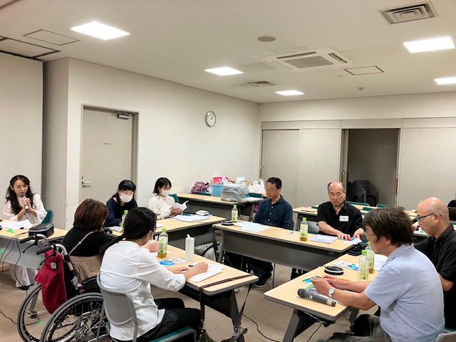 公益社団法人全国脊髄損傷者連合会の仲根建作様に長年のご経験に基づき、ピアサポートの活動のご説明と日々感じている課題をお話しいただきました。「医療との連携、地域移行時の情報提供、さまざまな場面での相談会の開催のほかに身近な場所でのゆんたくカフェで堅苦しくない世間話でつながりをもつ活動なども行なっている。令和3年からの法定研修化により、内容が私たちの望むものになっていない、雇用促進と言えるほどの加算になっていないなど問題があるが、過渡期と考え当面継続的な研修などが必要である。」などのお話を聞き、参加者がそれぞれ考えを深めました。